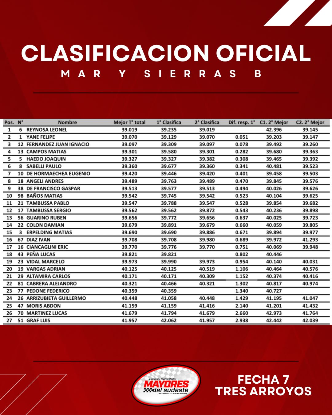 En Mar y Sierras B al igual que la carrera pasada fue Leonel Reynosa quien se llevo el mejor tiempo 39´019 seguido por Felipe Yane a 0,051 y Juan Ignacio Fernandez