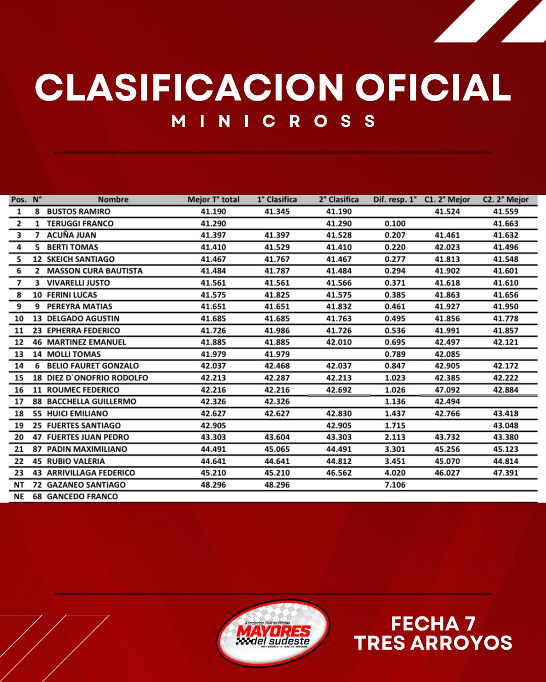 En la categoría Minicross el campeón Franco Teurggi domino gran parte de las tandas, pero tuvo que realizar un cambio de motor que lo relego al final de la clasificación. Fue Ramiro Bustos quien se llevo la Pole Position con 41´190 , seguido por Juan Acuña a 0,207 y Tomas Berti.